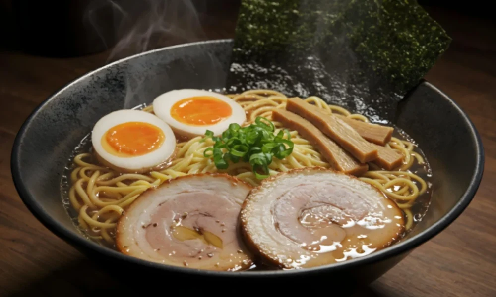 Traditional toppings complete each bowl: slow-braised chashu pork, fermented bamboo shoots, soft-boiled eggs, nori seaweed, green onions, and crispy garlic chips. Each component plays a specific role in the overall flavor profile.